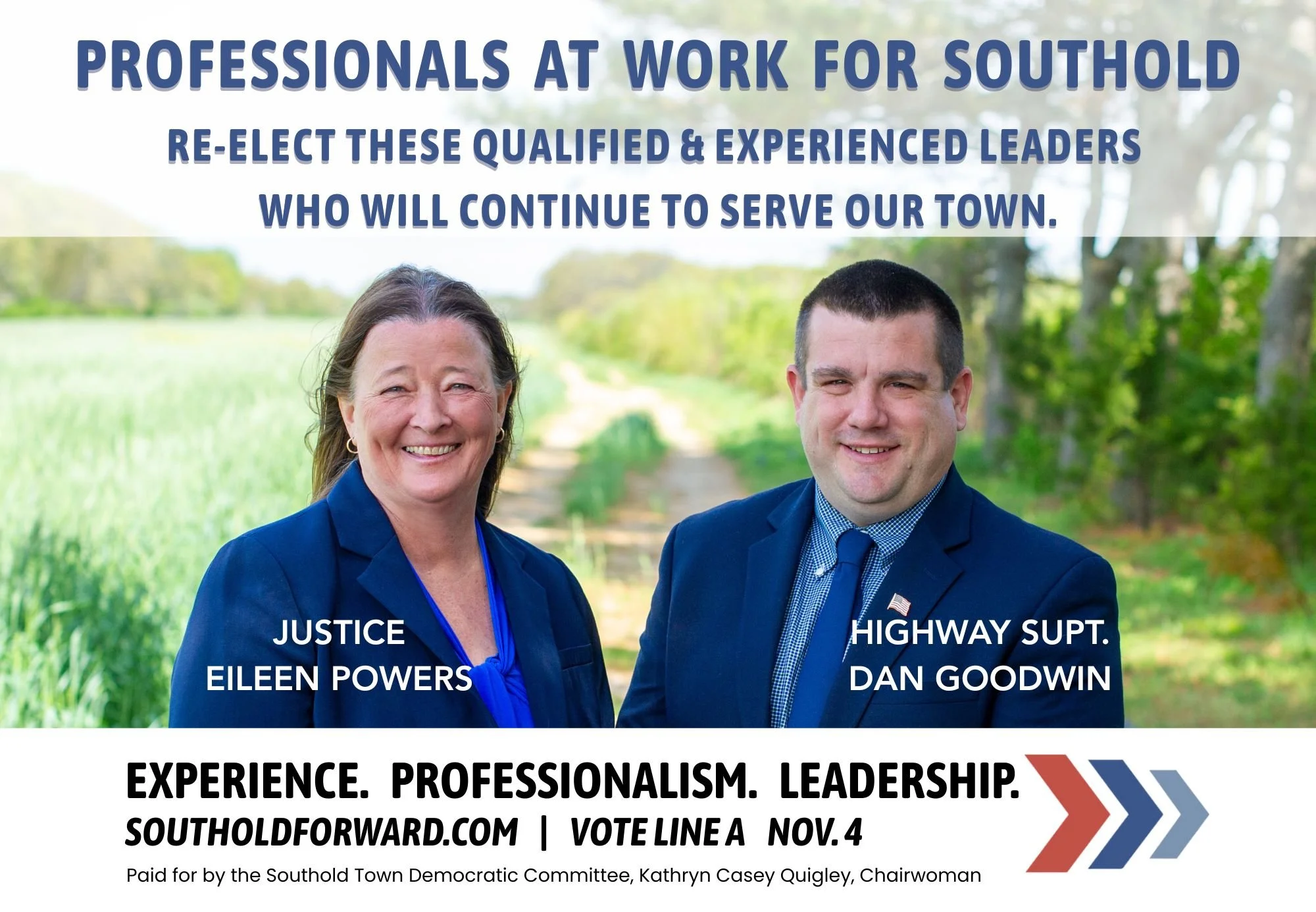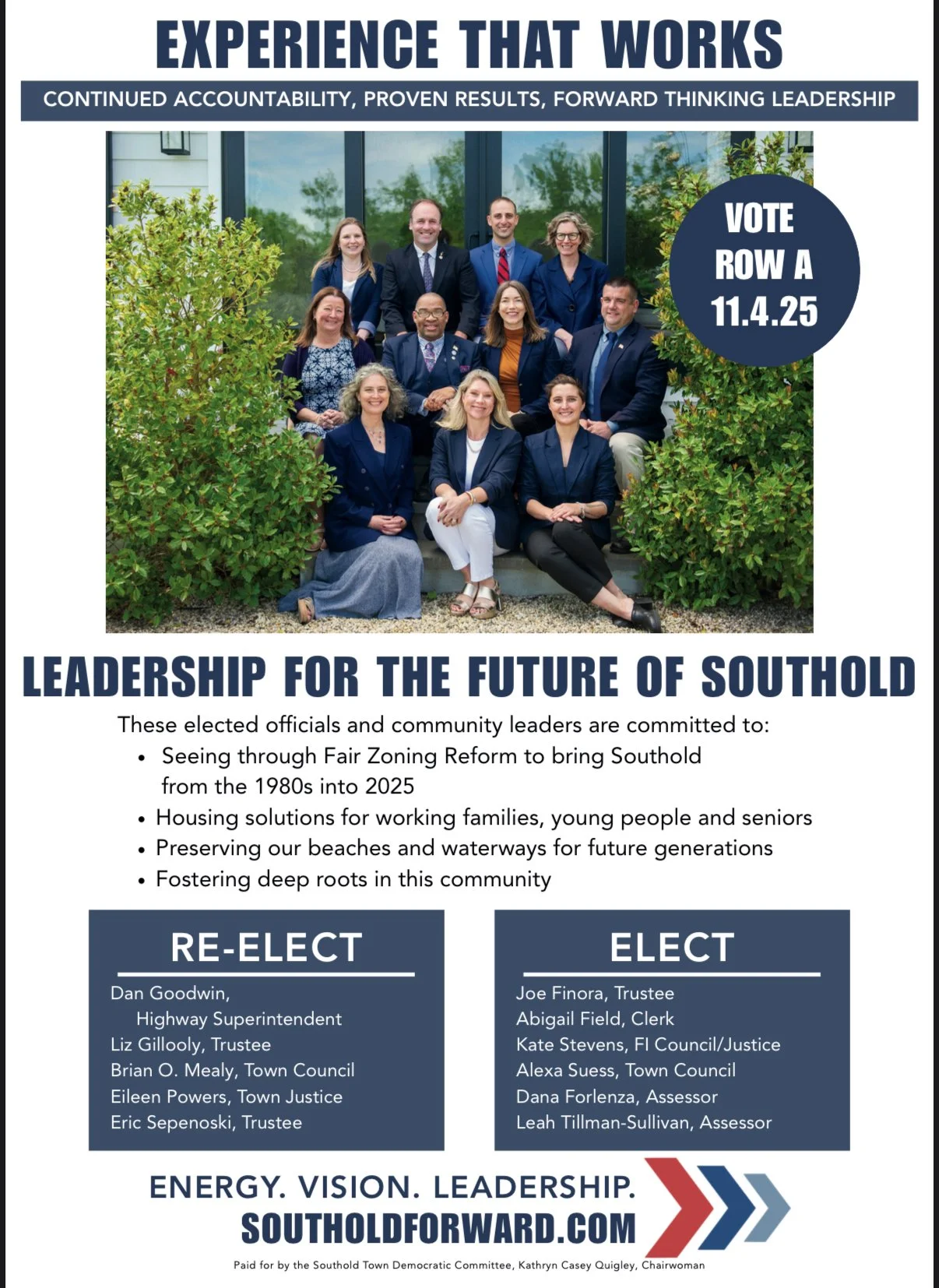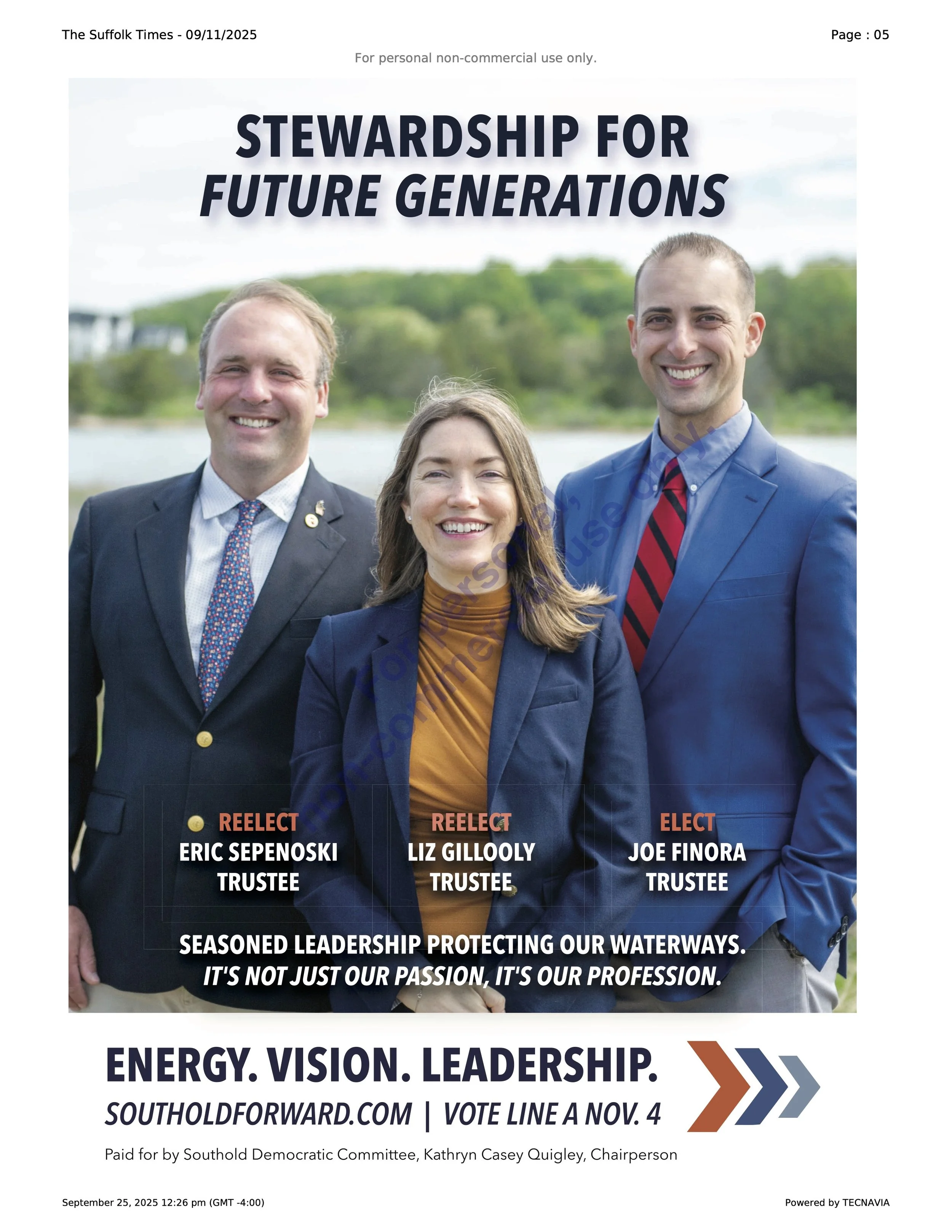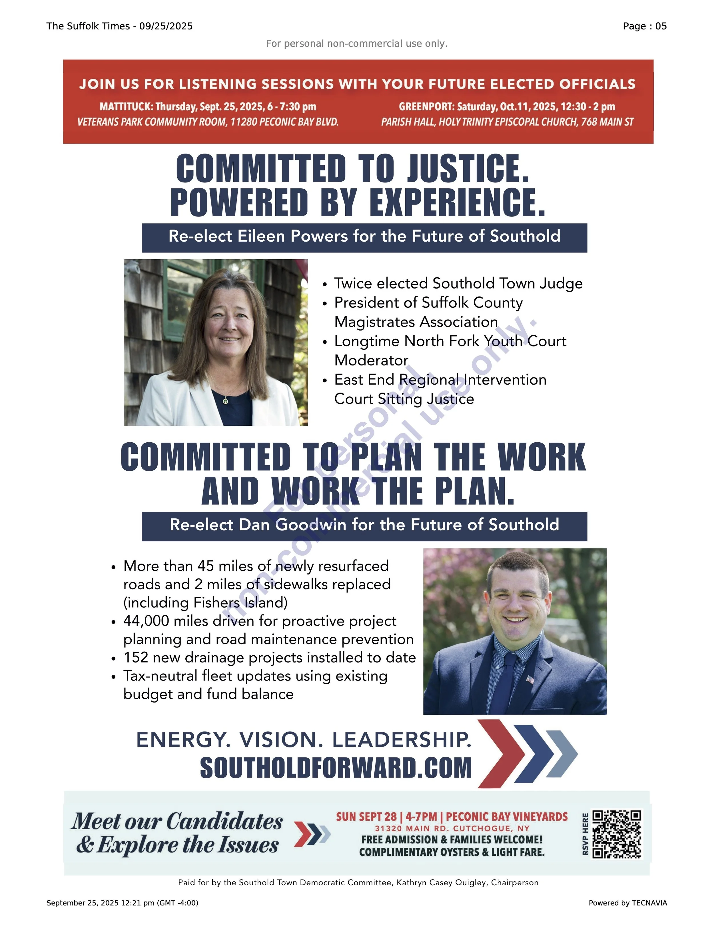 CAMPAIGN 2025 PRINT ADS EAST END BEACON SEPTEMBER 1, 2025 OCTOBER 1, 2025FULL SLATE OCTOBER 1, 2025POWERS - GOODWIN SUFFOLK TIMES AUGUST 21, 2025 AUGUST 28, 2025 SEPTEMBER 4, 2025 SEPTEMBER 11, 2025 SEPTEMBER 18, 2025FULL PAGE SEPTEMBER 18, 2025HALF PAGE SEPTEMBER 25, 2025